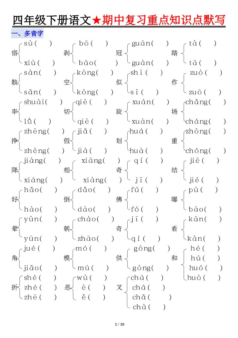 四年级下册语文全册课内重点早读晚默每日一练14天