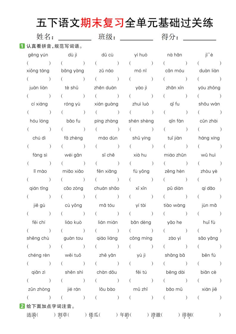 【期末必考四大专题考点精炼(专题一:全册基础知识)】五下语文