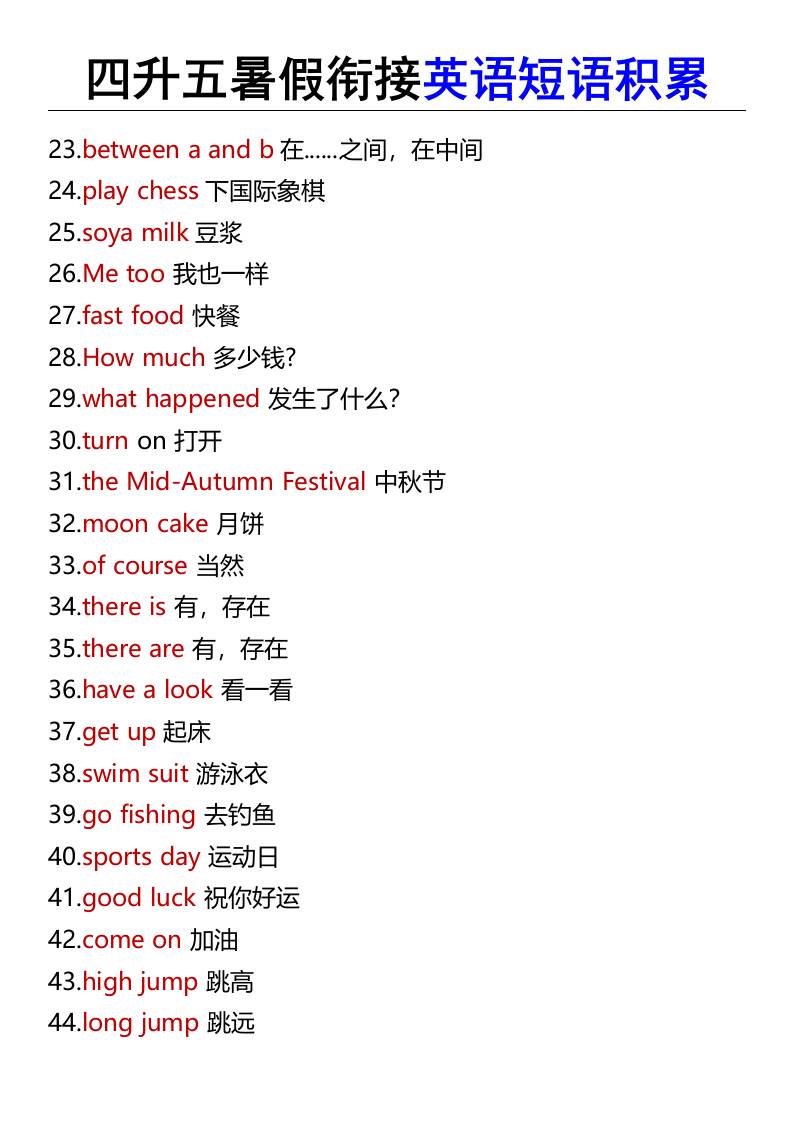四升五暑假衔接英语短语积累-五上英语
