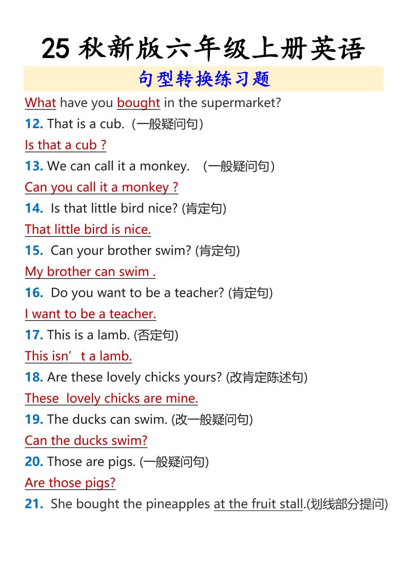 首页 > 全部 > 六英上 > 【2025秋新版】六年级上册英语句型转换练习题