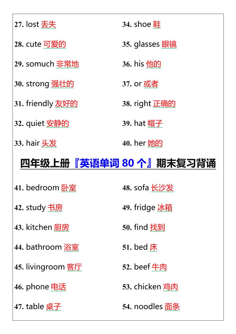 【2025秋新版】四年级上册『英语单词80个』期末复习背诵