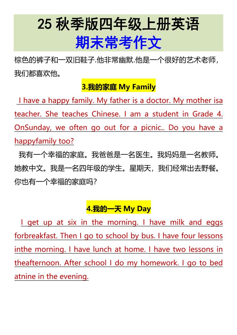 首页 > 全部 > 四英上 > 【2025秋新版】四年级上册英语•期末常考作文