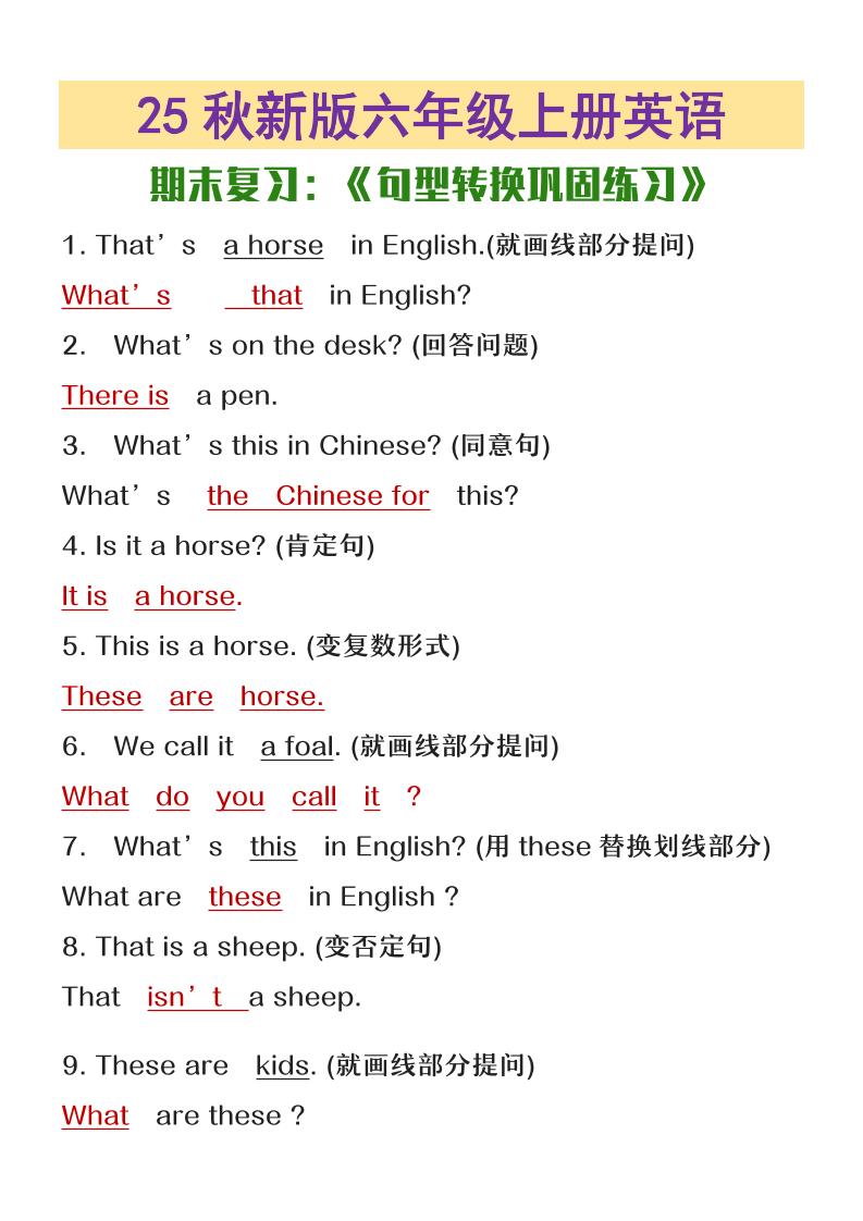 【2025秋新版】六年级上册英语专项训练句型转换