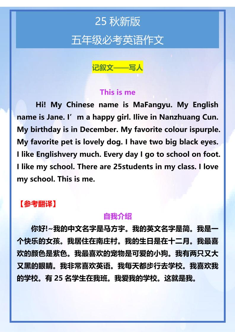 【2025秋新版】五年级必考英语作文范文-五上英语