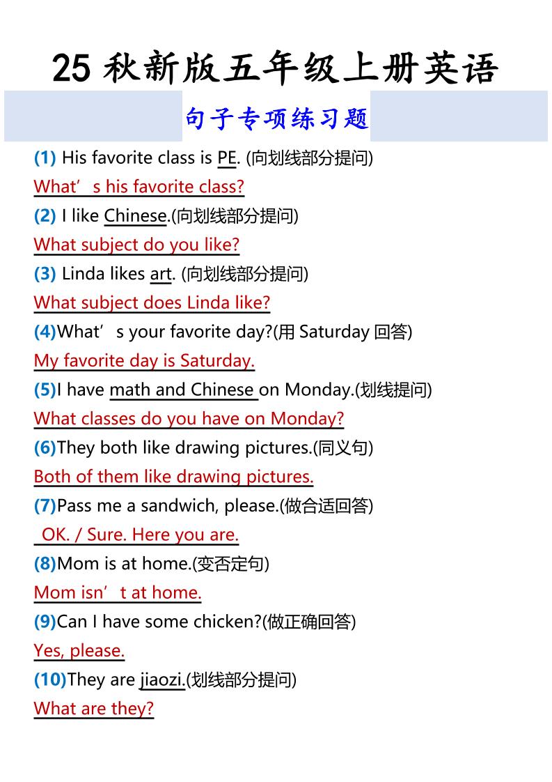 【2025秋新版】五年级英语学习技巧句型转换顺口溜,附练习题-五上英语