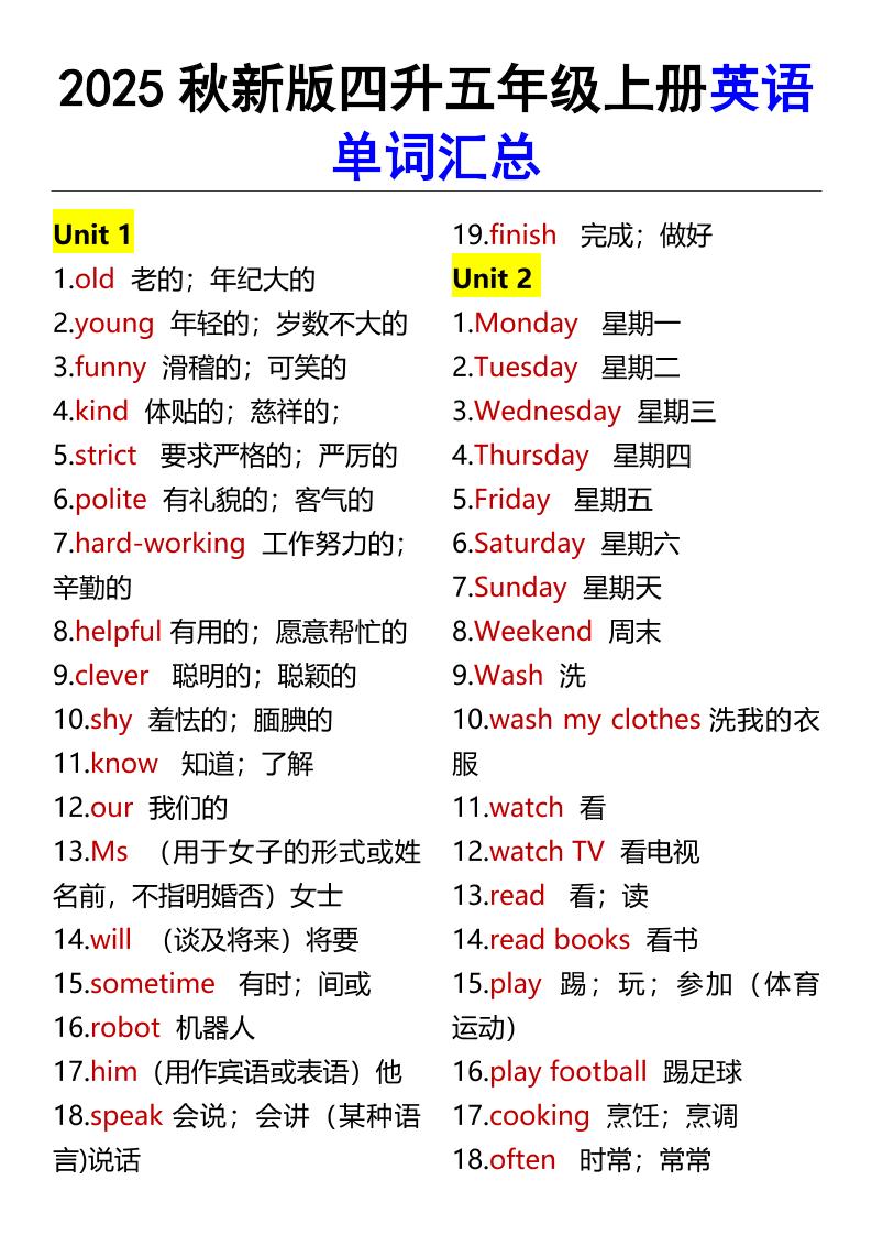 【2025秋新版】四升五年级上册英语单词汇总